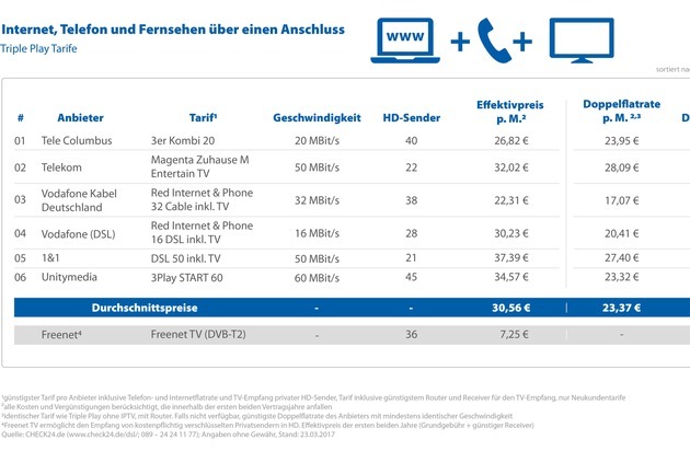 "Triple Play bietet Verbrauchern, die über einen schnellen Internettarif nachdenken und bislang ihr Fernsehprogramm über den abgeschalteten DVB-T-Standard bezogen haben, ein sinnvolles, günstiges Komplettpaket", sagt Erwin Biebrich, Geschäftsführer im Bereich Telekommunikationsdienste bei CHECK24.de.