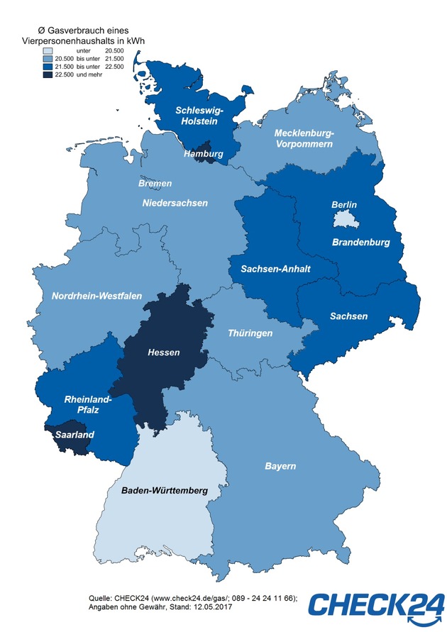 Familien aus dem Saarland verbrauchen bundesweit am meisten Gas: Im Schnitt benötigt ein Vierpersonenhaushalt dort 23.975 kWh Gas pro Jahr - rund ein Viertel mehr als Familien aus Berlin (Ø 19.345 kWh).1) Im Bundesdurchschnitt gaben CHECK24-Kunden in den vergangenen zwölf Monaten für einen Vierpersonenhaushalt einen jährlichen Gasverbrauch von 21.202 kWh an.