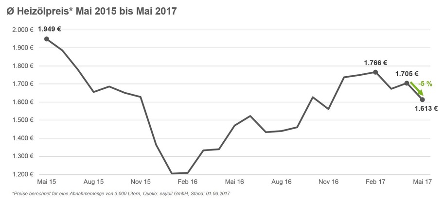 OPECDer monatliche Durchschnittspreis für Heizöl ist im Mai 2017 gegenüber dem Vormonat um rund fünf Prozent gesunken. 3.000 Liter kosteten durchschnittlich 1.613 Euro (April 2017: 1.705 Euro). Damit wurde ein neuer Jahrestiefstwert erreicht.