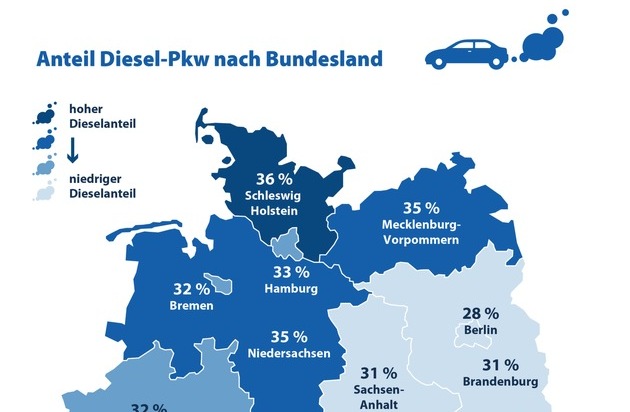 Am niedrigsten ist die Dieselquote mit jeweils 28 Prozent in Berlin und Sachsen. In den östlichen Bundesländern liegt der Anteil rund vier Prozent unter Bundesdurchschnitt, in den westlichen knapp darüber.