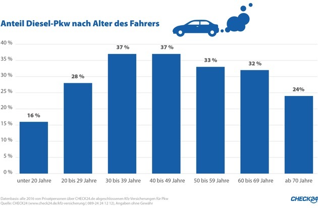 MarkenvergleichBei Fahranfängern und Senioren ist der Anteil von Diesel-Pkw niedriger als in anderen Altersgruppen. Nur 16 Prozent der unter 20-Jährigen haben einen Selbstzünder versichert. Bei den über 70-Jährigen sind es 24 Prozent. Am höchsten ist die Dieselquote der 30- bis 49-Jährigen mit 37 Prozent.*