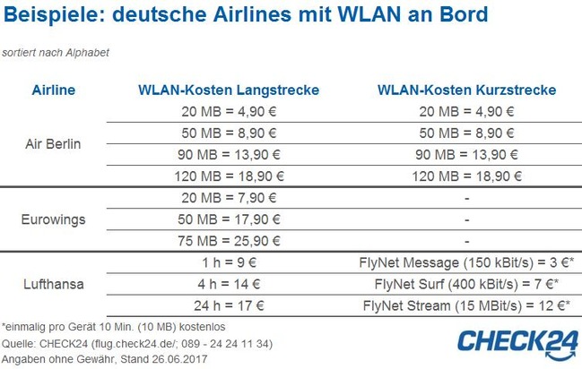 *)Tabellen mit allen betrachteten Fluggesellschaften und Flughäfen unter: http://ots.de/l4Gvh. Weitere Informationen unter: https://flug.check24.de/wlan-flughafen