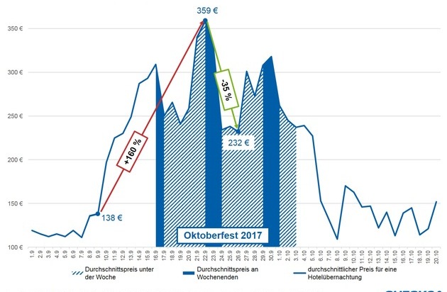 In München laufen bereits die Vorbereitungen für das 184. Oktoberfest vom 16. September bis zum 03. Oktober 2017. Auch dieses Jahr müssen Wiesnbesucher mit stark erhöhten Hotelpreisen rechnen. Am teuersten ist die Hotelübernachtung am zweiten Wochenende des Oktoberfests (22. bis 24. September), wenn traditionell zehntausende Italiener das größte Volksfest der Welt erobern. Während eine Übernachtung eine Woche vor Anstich durchschnittlich 138 Euro kostet, klettern die Preise am "Italienerwochenende" im Schnitt auf 359 Euro - ein Anstieg um 160 Prozent.*) Tipp: Etwas günstiger ist der Wiesnbesuch unter der Woche. Am erschwinglichsten Wochentag kostet ein Hotelzimmer durchschnittlich 232 Euro pro Nacht und damit immerhin 35 Prozent weniger als am teuersten Wochenende.