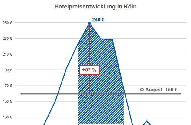Die durchschnittlichen Übernachtungspreise im gesamten Stadtgebiet steigen während der gamescom 57 Prozent über das Hotelpreisniveau im August. Am ersten öffentlichen Messetag (23. August) zahlen Besucher im Schnitt 249 Euro für eine Hotelübernachtung. Verstärkt wird die Preiserhöhung durch das gleichzeitig stattfindende YouTuber-Treffen VideoDays am 24. und 25. August.