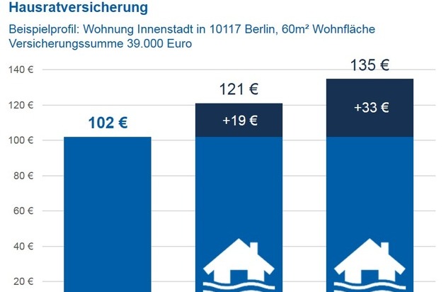 In der niedrigsten Hochwasser-Gefährdungsklasse (ZÜRS-Zone 1) erhalten Verbraucher Elementarschutz für ihren Hausrat ab sieben Euro pro Jahr. Im Schnitt der 77 betrachteten Tarife verteuert die Elementarabdeckung den Versicherungsbeitrag jährlich um 19 Euro. ZÜRS-Zone 1 umfasst gut 91 Prozent der Immobilien in Deutschland.3) Weitere sieben Prozent der Adressen liegen in ZÜRS-Zone 2. Für diese Gebiete kostet die Absicherung gegen Elementarschäden durchschnittlich 33 Euro pro Jahr. Der Aufpreis liegt zwischen sieben Euro und 216 Euro - ein Vergleich verschiedener Tarife lohnt sich.