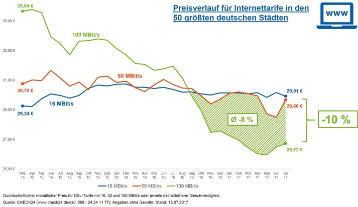 Highspeed-Internet ist 2017 so günstig wie nie. Zwischen März 2015 und Juli 2017 fiel der durchschnittliche Effektivpreis für Internettarife mit mindestens 100 MBit/s um 25 Prozent. Im Juli 2017 kostete eine Doppelflatrate mit Highspeed-Internet im Schnitt der 50 größten deutschen Städte 26,72 Euro effektiv pro Monat. In Dresden sank der monatliche Durchschnittspreis sogar noch stärker. Hier zahlten Internetkunden für einen Doppeltarif ab 100 MBit/s im Schnitt 31 Prozent weniger als 2015. In Berlin dagegen sank der Preis für diese Surfgeschwindigkeit im gleichen Zeitraum nur um 14 Prozent. Die durchschnittlichen Effektivpreise unterscheiden sich regional vor allem durch Sonderaktionen wie Neukundenboni oder Wechselprämien der Provider.