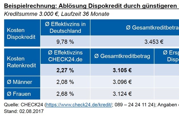 1)Beispielrechnung für einen Ratenkredit über 3.000 Euro mit einer Laufzeit von 36 Monaten. Der Vergleich setzt die durchschnittlich in Deutschland erhobenen Zinsen für einen Dispositionskredit in Relation zu den durchschnittlichen Effektivzinsen, die CHECK24-Kunden für einen Ratenkredit zur Ablösung eines Dispo in gleicher Höhe zahlen. Der Effektivzins ist auf zwei Nachkommstellen gerundet. Berücksichtigt wurden alle zwischen April 2016 und März 2017 über CHECK24.de abgeschlossenen Ratenkredite mit Verwendungszweck "Ausgleich Dispo" oder zur freien Verwendung und einer Kreditsumme zwischen 1.000 und 5.000 Euro. Zur besseren Vergleichbarkeit wurden Dispo- und Ratenkredit im Beispiel über drei Jahre mit fixen monatlichen Raten getilgt. Weitere Infos unter https://www.check24.de/kredit/publikationen/zinsen-dispo-ratenkredit/.