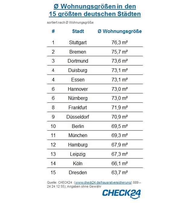 - Je größer der Wohnort desto kleiner die WohnungStuttgarter haben die größten Wohnungen. Im Vergleich der 15 größten deutschen Städte geben CHECK24-Kunden aus Stuttgart bei Abschluss einer Hausratversicherung im Schnitt 20 Prozent mehr Wohnfläche an als Verbraucher aus Dresden: Die Schwaben leben auf 76,3 m², Dresdner nur auf 63,7 m².*