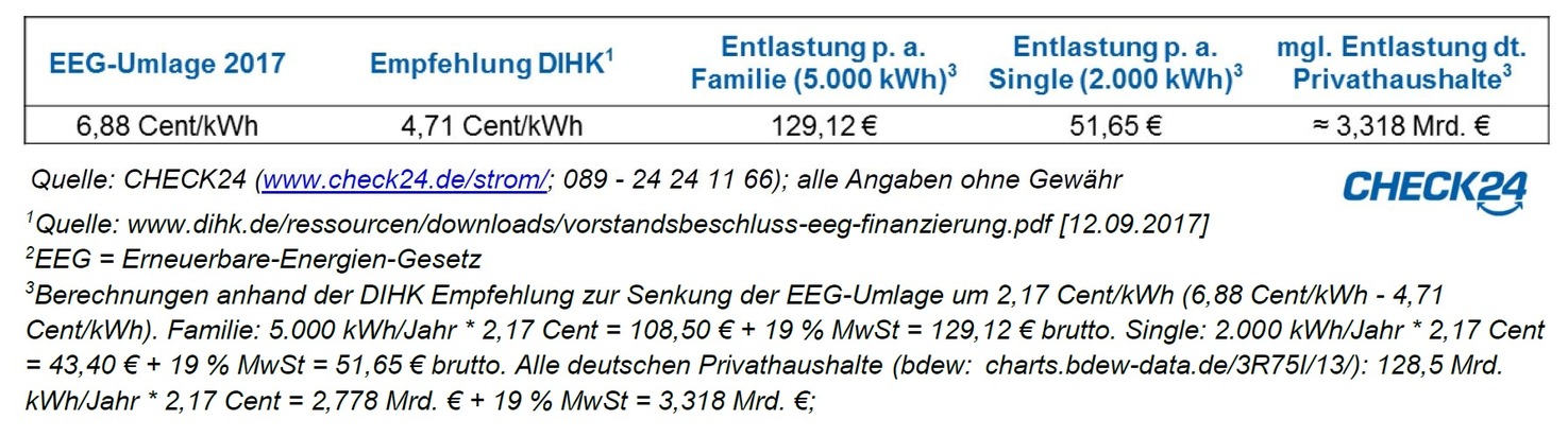3)Berechnungen anhand der DIHK Empfehlung zur Senkung der EEG-Umlage um 2,17 Cent/kWh (6,88 Cent/kWh - 4,71 Cent/kWh). Familie: 5.000 kWh/Jahr * 2,17 Cent = 108,50 EUR + 19 % MwSt = 129,12 EUR brutto. Single: 2.000 kWh/Jahr * 2,17 Cent = 43,40 EUR + 19 % MwSt = 51,65 EUR brutto. Alle deutschen Privathaushalte (bdew: charts.bdew-data.de/3R75I/13/): 128,5 Mrd. kWh/Jahr * 2,17 Cent = 2,778 Mrd. EUR + 19 % MwSt = 3,318 Mrd. EUR;