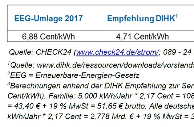 Schnitt 1.427 EuroIn einem Vorstandsbeschluss empfiehlt der Deutsche Industrie- und Handelskammertag e. V. (DIHK), die Umlage zur Förderungen erneuerbarer Energien von aktuell 6,88 auf 4,71 Cent/kWh Strom zu verringern.1)