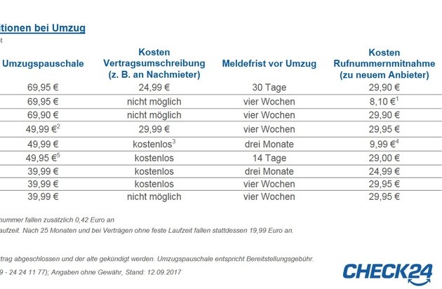Providern möglichVerbraucher, die ihren bestehenden Internetvertrag beim Umzug in eine neue Wohnung mitnehmen möchten, zahlen dafür einmalig zwischen 40 und 70 Euro. Bei keinem der neun betrachteten DSL- und Kabelanbieter ist die Vertragsmitnahme kostenlos. Je nach Anbieter muss der Umzug zwischen 14 Tagen und drei Monaten im Voraus gemeldet werden.