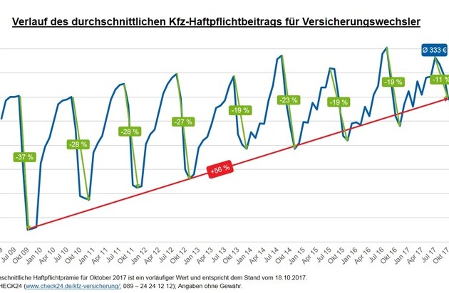 Das vorläufige Prämienniveau von Oktober 2017 liegt bislang acht Prozent über dem Vorjahreswert und sogar 56 Prozent über dem Oktoberwert von 2009. Damals zahlten CHECK24-Kunden im Schnitt 190 Euro für ihre Kfz-Haftpflichtversicherung - 107 Euro weniger als heute.