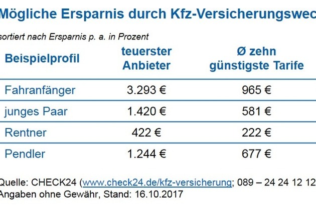Ein Wechsel der Kfz-Versicherung lohnt sich in vielen Fällen. Das zeigen 15 exemplarische Berechnungen verschiedener Fahrerprofile von CHECK24.de.*) Ein junges Paar zahlt im Schnitt der zehn günstigsten Tarife 581 Euro jährlich, beim teuersten Anbieter werden 1.420 Euro fällig. Das entspricht einer möglichen Ersparnis von 839 Euro bzw. 59 Prozent.