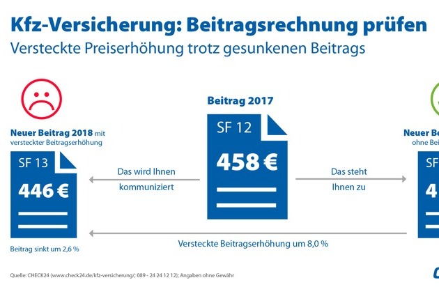 Beitragserhöhungen aufzudeckenKfz-Halter sollten die Beitragsrechnung ihrer Kfz-Versicherung für kommendes Jahr genau prüfen. Blieb der Versicherungsnehmer im abgelaufenen Jahr unfallfrei, verbessert sich 2018 seine Schadenfreiheitsklasse (SF-Klasse). Dadurch verringert sich der Versicherungsbeitrag. Versicherer können dadurch Preiserhöhungen leicht kaschieren.