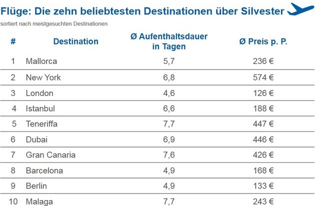 bleiben zu HauseMallorca ist das beliebteste Ziel für eine Flugreise zum Jahreswechsel.*) New York und London sind ebenfalls gefragte Destinationen, um dort auf das neue Jahr anzustoßen - sie folgen auf den Plätzen zwei und drei. Mit Berlin schafft es nur ein deutsches Ziel unter die Top Ten.