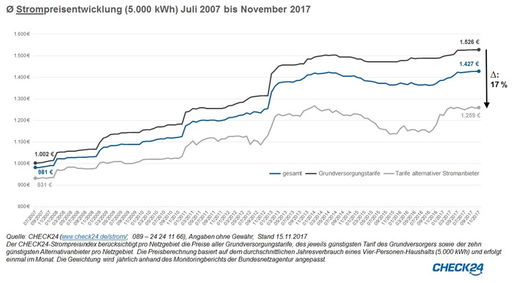 spart aktuell Ø 267 EuroAm hohen Strompreisniveau für Verbraucher ändert sich zum Jahresbeginn 2018 wenig. 55 Grundversorger haben Preiserhöhungen um durchschnittlich 2,9 Prozent angekündigt. Dem stehen Preissenkungen bei 56 Versorgern um durchschnittlich 2,3 Prozent gegenüber. Unterm Strich passt somit etwa jeder achte der knapp 900 Grundversorger seine Preise an.*