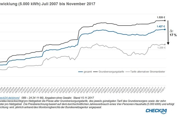 Der Strompreis für Endkunden hält sein Rekordniveau. Im November 2017 kosteten 5.000 kWh im Schnitt 1.427 Euro. Die Differenz zwischen der Grundversorgung und den Tarifen alternativer Stromanbieter beträgt 17 Prozent oder 267 Euro.**