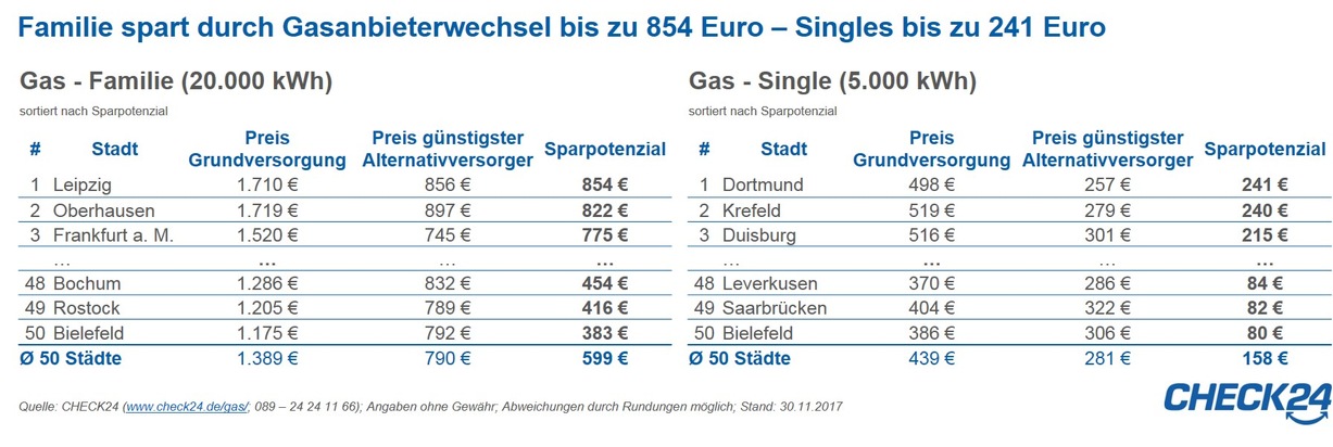*)Tabellen mit allen 50 Städten unter http://ots.de/9whde. Deutschlandkarte mit Städtevergleich unter https://www.check24.de/strom-gas/staedtevergleich/