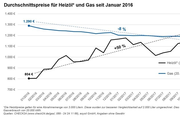 - Durchschnittlicher monatlicher Heizölpreis seit Januar 2016 um