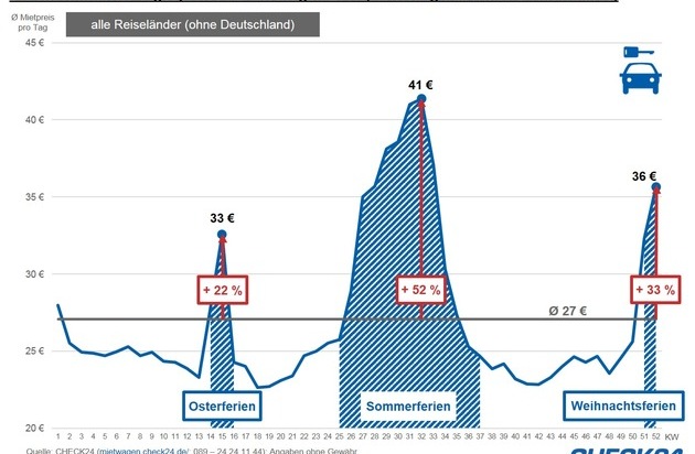 um Ø 33 ProzentIn der Feriensaison kosten Mietwagen in Urlaubsländern deutlich mehr als im Rest des Jahres. Verbraucher zahlten in den Sommerferien für ein Leihfarzeug in beliebten Urlaubsländern im Schnitt bis zu 52 Prozent mehr als im Jahresmittel 2017.*)
