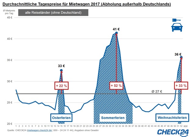 um Ø 33 ProzentIn der Feriensaison kosten Mietwagen in Urlaubsländern deutlich mehr als im Rest des Jahres. Verbraucher zahlten in den Sommerferien für ein Leihfarzeug in beliebten Urlaubsländern im Schnitt bis zu 52 Prozent mehr als im Jahresmittel 2017.*)
