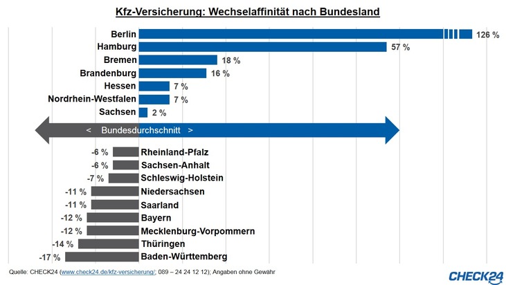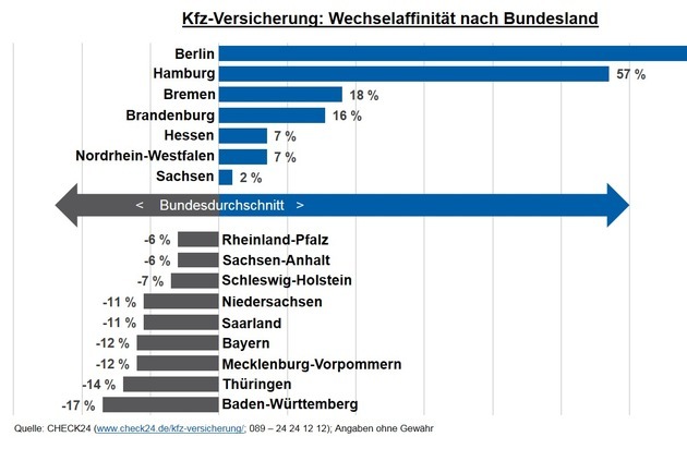 Vorjahr am stärkstenBerliner sind bei ihrer Kfz-Versicherung besonders wechselfreudig. In der Hauptstadt wechseln 126 Prozent mehr Pkw-Halter ihre Kfz-Versicherung als im Schnitt der Bundesländer.*) Auch in Hamburg gibt es im Vergleich zur Anzahl der dort lebenden Pkw-Halter besonders viele Versicherungswechsler.