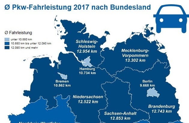 - Kfz-Halter in Deutschland fahren durchschnittlich 11.888 Kilometer pro Jahr mit ihrem Auto - jährliche Fahrleistung in Flächenländern im Schnitt 2.000 Kilometer größer als in Stadtstaaten - 50- bis 59-Jährige sind die meisten Kilometer unterwegs, über 70-Jährige die wenigsten
