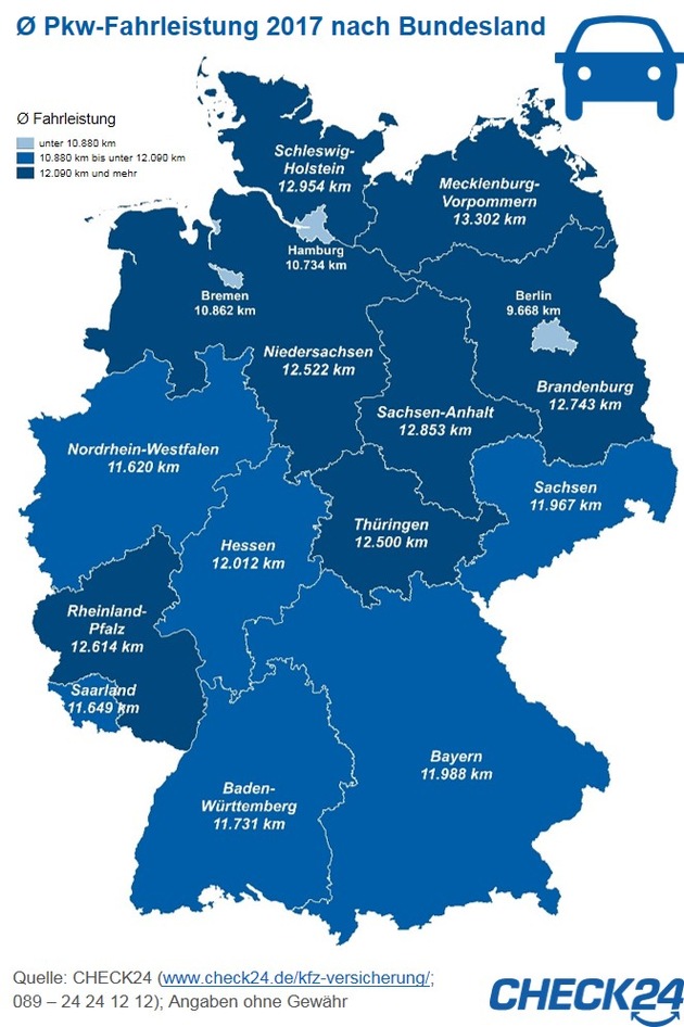 Autofahrer aus Mecklenburg-Vorpommern legen im Jahr durchschnittlich 13.302 Kilometer zurück. Das sind 3.634 Kilometer bzw. 38 Prozent mehr als Pkw-Halter in Berlin (9.668 Kilometer). Im Bundesdurchschnitt fahren CHECK24-Kunden nach eigener Auskunft jährlich 11.888 Kilometer.*) Verbraucher, die sich unsicher bei der Angabe ihrer jährlichen Fahrleistung oder anderen Versicherungsmerkmalen sind, erhalten bei über 200 CHECK24-Versicherungsexperten eine persönliche Beratung.