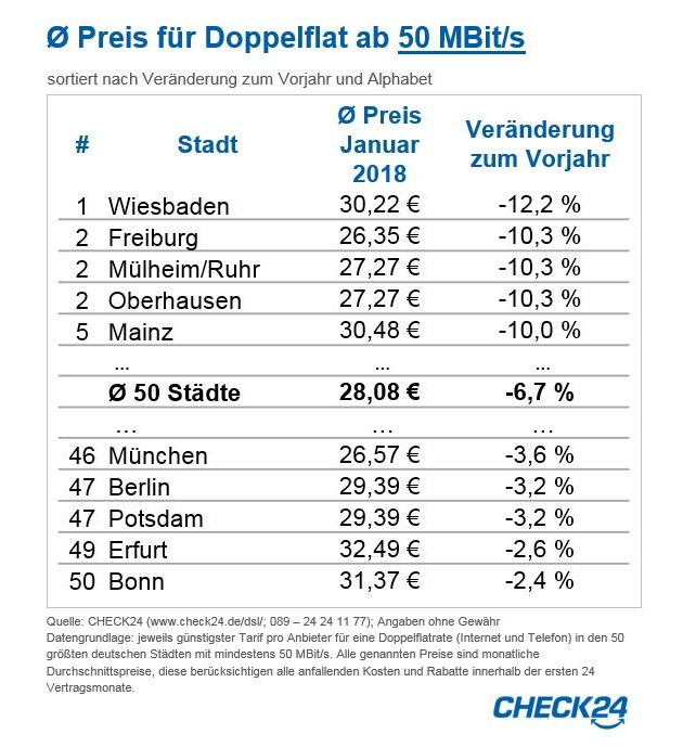 MBit/sDoppelflatrates (Internet und Telefon) mit Surfgeschwindigkeiten ab 50 MBit/s wurden im Vergleich zum Vorjahr im Durchschnitt um 6,7 Prozent günstiger. Für Wiesbadener verringerte sich der durchschnittliche Preis am stärksten. In der hessischen Landeshauptstadt zahlen Verbraucher mit durchschnittlich 30,22 Euro im Monat 12,2 Prozent weniger als vor einem Jahr. Trotzdem ist schnelles Internet dort weiterhin überdurchschnittlich teuer.*