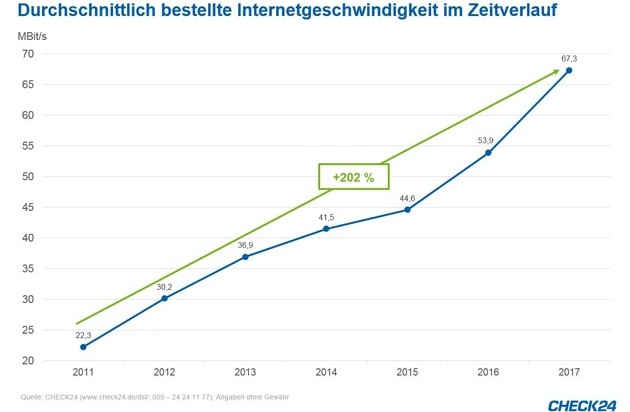 *durchschnittlich bestellte Internetgeschwindigkeit aller Abschlüsse von CHECK24-Kunden im Jahr 2017. Tabelle mit allen betrachteten Städten unter http://ots.de/SNLQRN