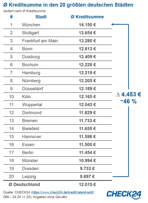Im Bundesdurchschnitt leihen sich CHECK24-Kunden 12.015 Euro bei der Bank.