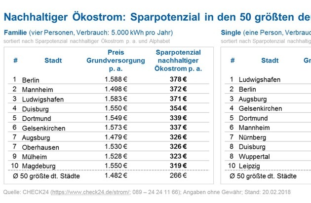 Dabei kann eine vierköpfige Familie bei einem Verbrauch von 5.000 kWh p. a. auch mit nachhaltigem Ökostrom sparen: In den 50 größten deutschen Städten zahlen sie mit dem jeweils günstigsten nachhaltigen Ökostromtarif im Durchschnitt 266 Euro weniger im Vergleich zur Grundversorgung. In der Spitze reduziert eine Familie in Berlin ihre Stromrechnung um 378 Euro.