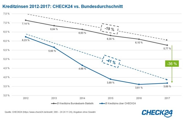 - Ø Kreditzins über CHECK24 ist 36 Prozent niedriger als im