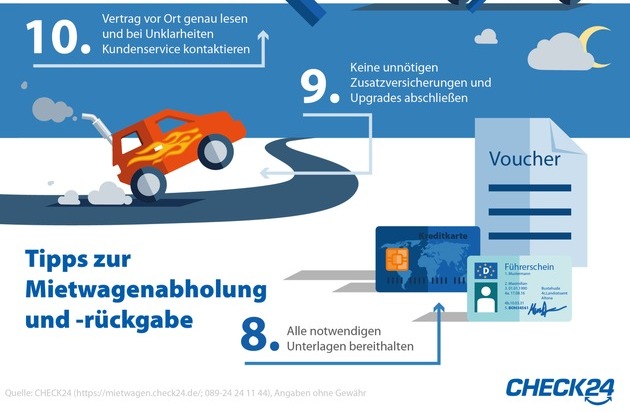 9. Keine unnötigen Zusatzversicherungen und Upgrades: Manchmal versuchen Vermieter, vor Ort zusätzliche Versicherungen oder Upgrades in eine höhere Fahrzeug¬klasse zu verkaufen. CHECK24 weist in einem Merkblatt auf unnötige Versicherungen hin und unterstützt Kunden bei Problemen auch telefonisch.