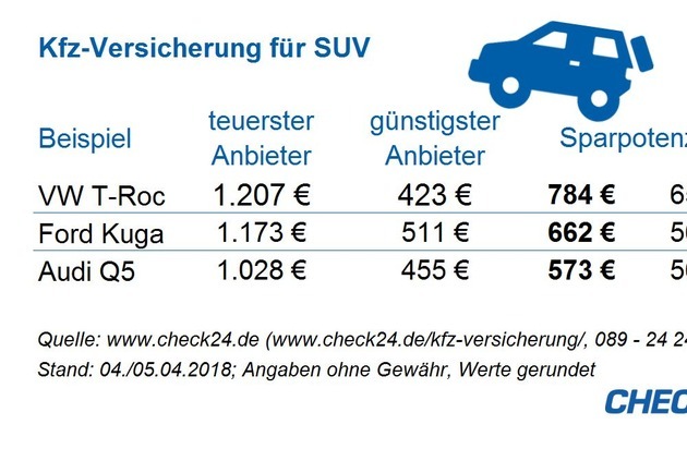 Die Kfz-Versicherung für einen SUV ist oft teurer als für Kompakt- oder Mittelklasse-Pkw. Umso größer ist das Sparpotenzial durch einen Vergleich verschiedener Tarife. Beispielrechnungen für vollkaskoversicherte SUV zeigen, dass der Anbietervergleich die jährlichen Kosten für die Kfz-Versicherung um bis zu 784 Euro reduziert.