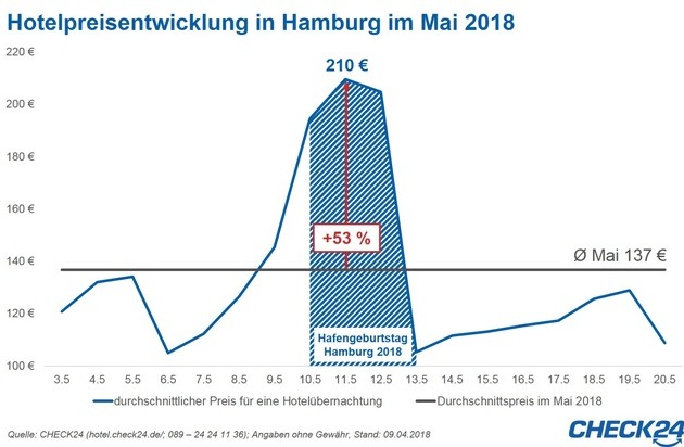 *)allgemeine Suchkriterien: mind. zwei Sterne, mind. sieben von zehn Punkte in der Kundenbewertung auf CHECK24, max. zwei Kilometer Luftlinie vom Hamburger Hafen (Platz der Deutschen Einheit, 20457 Hamburg) entfernt. Übernachtungszeitraum während des Hafengeburtstags: Freitag, 11.05.2018 bis Samstag, 12.05.2018, Übernachtungszeitraum Vergleichswochenende: Freitag, 18.05.2018 bis Samstag, 19.05.2018; Stand der Preise: 09.04.2018; alle genannten Preise gelten pro Nacht für ein Doppelzimmer (ein Zimmer, zwei Erwachsene). Tabellen verfügbar unter: http://ots.de/gSGyGT