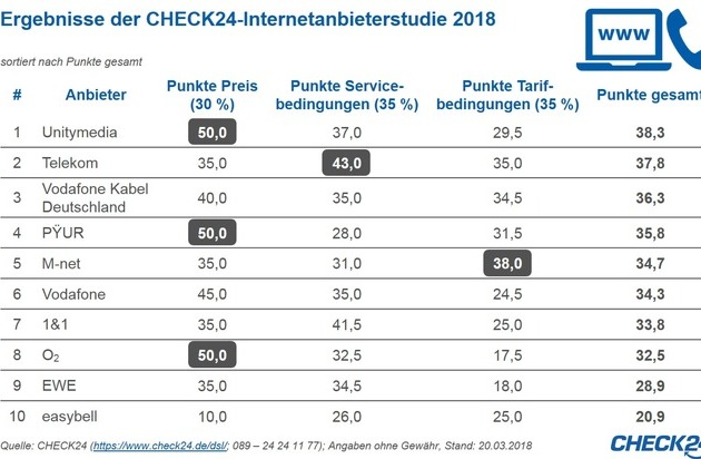CHECK24 hat Doppelflats (Internet und Telefon) von zehn DSL- und Kabelanbietern anhand der Teilkategorien Preis, Service- sowie Tarifbedingungen getestet. Das Ergebnis: Unitymedia ist der beste Internetanbieter im Test. Auf den Plätzen zwei und drei folgen die Telekom und Vodafone Kabel Deutschland.1) "Das beste Preis-Leistungs-Verhältnis im Test lieferte Unitymedia", sagt Erwin Biebrich, Geschäftsführer Telekommunikation bei CHECK24. "Der Kölner Kabelnetzbetreiber überzeugte insbesondere mit einem sehr günstigen Preis in Verbindung mit guten Servicebedingungen."