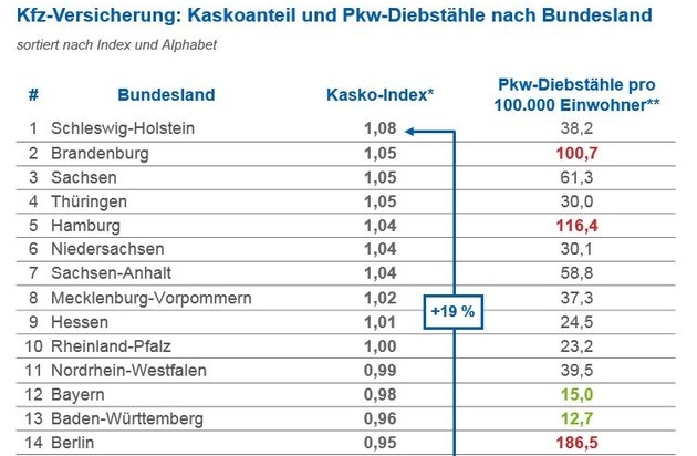 KaskoanteilBerliner versichern ihren Pkw fünf Prozent seltener mit einer Kaskoversicherung gegen Diebstahl als der Bundesdurchschnitt, obwohl Berlin die Hochburg der Pkw-Diebstähle ist. (1) Pro 100.000 Einwohner wurden dort im vergangenen Jahr 186,5 Fahrzeuge gestohlen - so viele wie in keinem anderen Bundesland. (2)