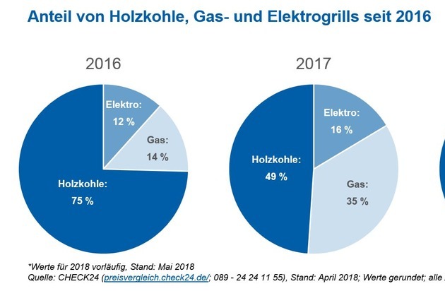 Grillen mit Kohle wird immer unbeliebter. Im vergangenen Jahr war nur noch jedes zweite über CHECK24 verkaufte Grillgerät ein Holzkohlegrill. 2016 lag der Anteil noch bei 75 Prozent. Der Trend zu Gas- und Elektrogrills zeichnet sich auch in den ersten Monaten des aktuellen Jahres ab.