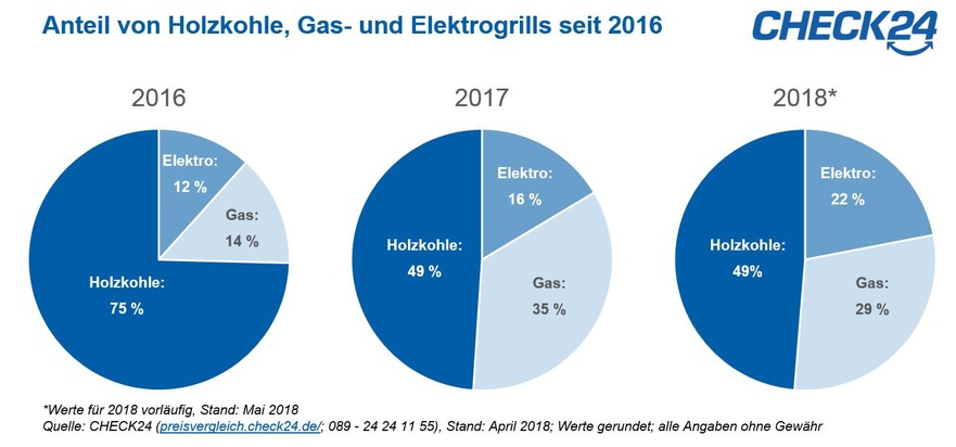 Grillen mit Kohle wird immer unbeliebter. Im vergangenen Jahr war nur noch jedes zweite über CHECK24 verkaufte Grillgerät ein Holzkohlegrill. 2016 lag der Anteil noch bei 75 Prozent. Der Trend zu Gas- und Elektrogrills zeichnet sich auch in den ersten Monaten des aktuellen Jahres ab.