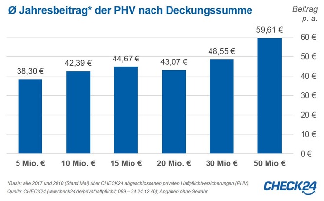 Guter Schutz ist günstig. Für Verträge mit fünf Millionen Euro Deckung zahlten CHECK24-Kunden im betrachteten Zeitraum rund 38 Euro pro Jahr, für die doppelte Summe nur rund vier Euro mehr. Selbst über CHECK24 abgeschlossene Tarife mit 50 Mio. Euro DS kosten im Schnitt weniger als 60 Euro pro Jahr.