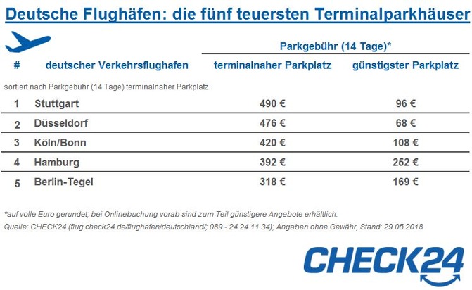 *)Preise gelten für die offiziellen Parkhäuser der 23 betrachteten deutschen Flughäfen. Bei Onlinebuchung vorab sind zum Teil günstigere Angebote erhältlich. Tabellen mit allen betrachteten Flughäfen unter: http://ots.de/rDw07Z. Weitere Informationen unter: https://flug.check24.de/service/parken-am-flughafen.