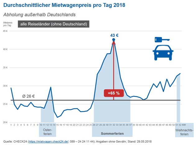 Urlauber zahlen in den Sommerferien deutlich mehr für einen Mietwagen als im restlichen Jahr. Im Vergleich zum Jahresmittel steigt der durchschnittliche Tagesmietpreis in den Sommermonaten in Urlaubsländern um bis zu 65 Prozent. Für das Leihauto werden dann im Schnitt bis zu 43 Euro statt 26 Euro pro Tag fällig.*)