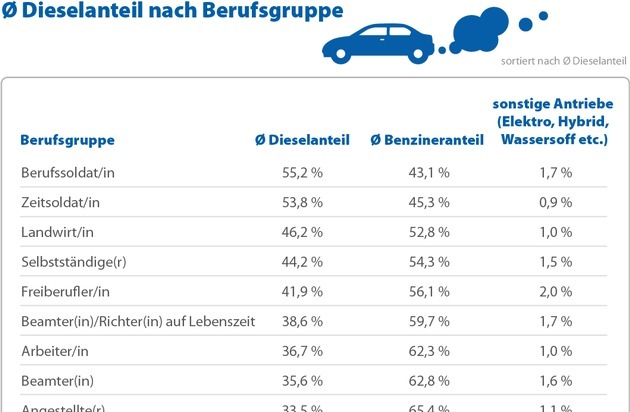 Wenig Anklang finden Selbstzünder bei Teilnehmern des Bundesfreiwilligendienstes (Bufdi) und Auszubildenden. Aber auch Rentner versichern vergleichsweise wenige Dieselfahrzeuge.