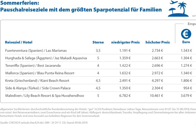 *allgemeine Suchkriterien: durchschnittliche Kundenbewertung der Hotels mind. "gut" (4,3/6 Punkten); Reisedauer sieben Tage, Reisezeitraum vom 01.07. bis 31.08.2018; Hotel im Angebot von mindestens drei Reiseveranstaltern in gleicher Reisekonfiguration; zwei Erwachsene und ein Kind (elf Jahre); Abflugort (deutschlandweit), Transfer, Verpflegung und Zimmerkategorie bei allen Anbietern pro Hotel gleich; betrachtete Hotels sind eine Auswahl aus beliebten Regionen für den Sommerurlaub; Tabelle mit allen betrachteten Angeboten unter: http://ots.de/Ah5fGh