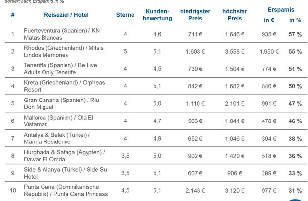 *)allgemeine Suchkriterien: mind. 3,5 Sterne, durchschnittliche Kundenbewertung der Hotels mind. gut (4,3 von sechs Punkte); Reise¬dauer: sieben Tage, Reisezeitraum vom 15.09. bis 31.10.2018; Hotel im Angebot von mindestens drei Reiseveranstaltern in gleicher Reisekonfiguration; zwei Erwachsene; Abflugort: deutschlandweit, Transfer enthalten, Verpflegung und Zimmer¬kategorie bei allen Anbietern pro Hotel gleich; betrachtete Hotels sind eine Auswahl aus Top-Buchungsregionen für den Sommer¬urlaub; Überschneidungen zwischen günstigsten Hotels und Hotels mit besten Bewertungen möglich; Tabelle mit allen betrachteten Angeboten unter http://ots.de/8Y8xRd