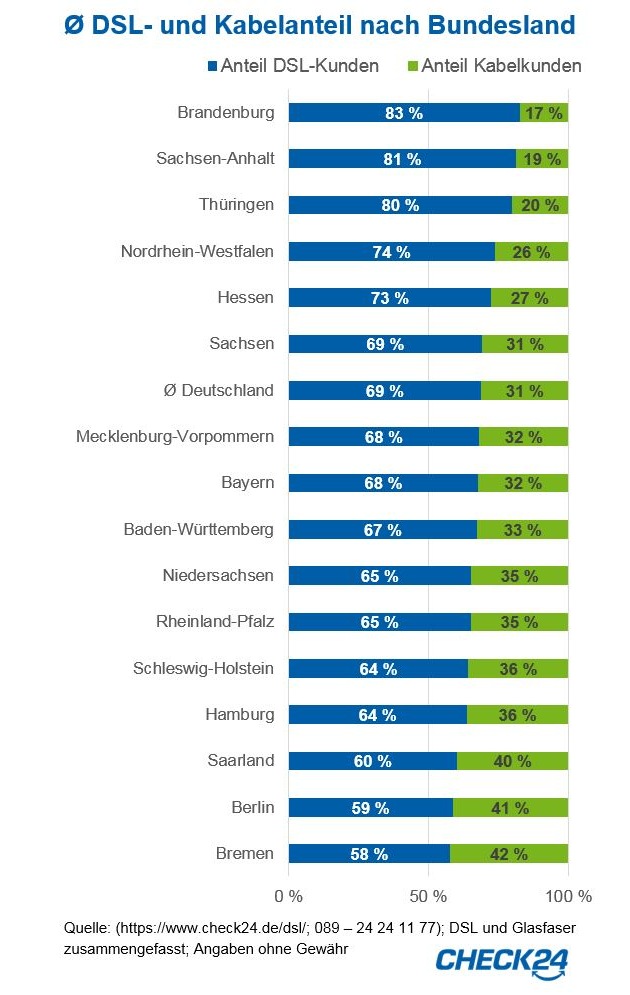 Kabelhochburg LeipzigIn Brandenburg bestellen 83 Prozent der Verbraucher ihren Internetvertrag bei einem DSL-Anbieter, 17 Prozent nutzen Kabelangebote. Auch in den ostdeutschen Flächenländern Sachsen-Anhalt und Thüringen bestellen mehr als 80 Prozent Internetangebote von DSL-Anbietern.[1]