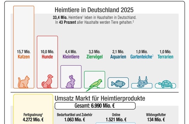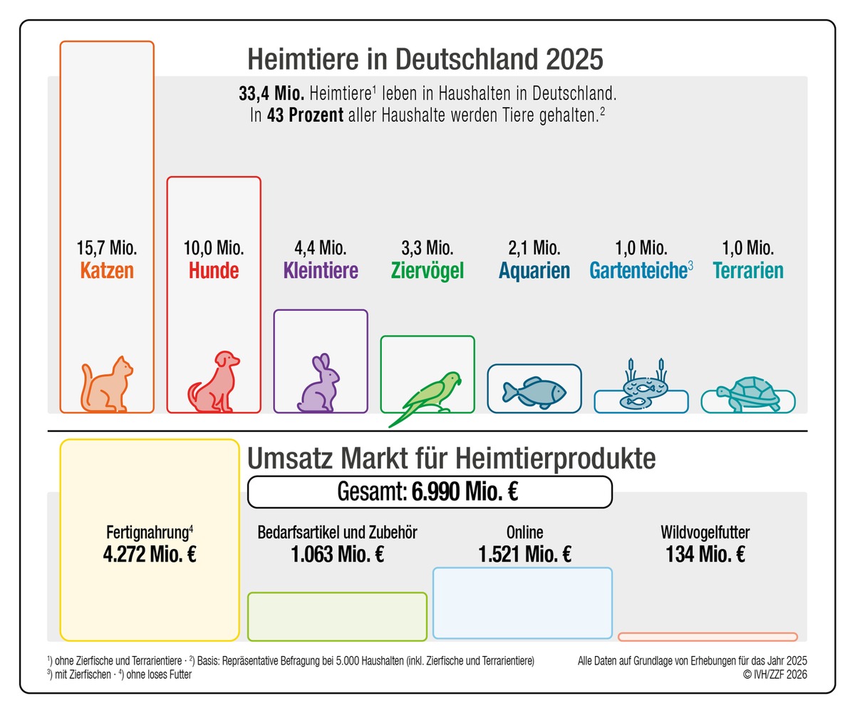 Im Jahr 2025 lebten 33,4 Millionen Hunde, Katzen, Kleinsäuger und Ziervögel in Haushalten in Deutschland. Hinzu kamen zahlreiche Zierfische und Terrarientiere. Insgesamt lebte in 43 Prozent aller Haushalte in Deutschland mindestens ein Heimtier. Das ist das Ergebnis einer haushaltsrepräsentativen Erhebung, die das Marktforschungsinstitut Skopos für IVH und ZZF durchgeführt hat (Telefon- und Online-Erhebung, Basis 5.000 Befragte).