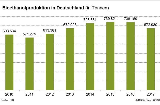 Der Bundesverband der deutschen Bioethanolwirtschaft (BDBe) teilt mit, dass in Deutschland der Absatz von Bioethanol im Benzin im Jahr 2017 um knapp 2 Prozent auf 1,15 Mio. Tonnen gesunken ist. Die deutsche Bioethanolproduktion erreichte nur 0,67 Mio. Tonnen, das entspricht einem deutlichen Rückgang um 8,8 Prozent. Grund dafür war der stagnierende Absatz von Super E10.