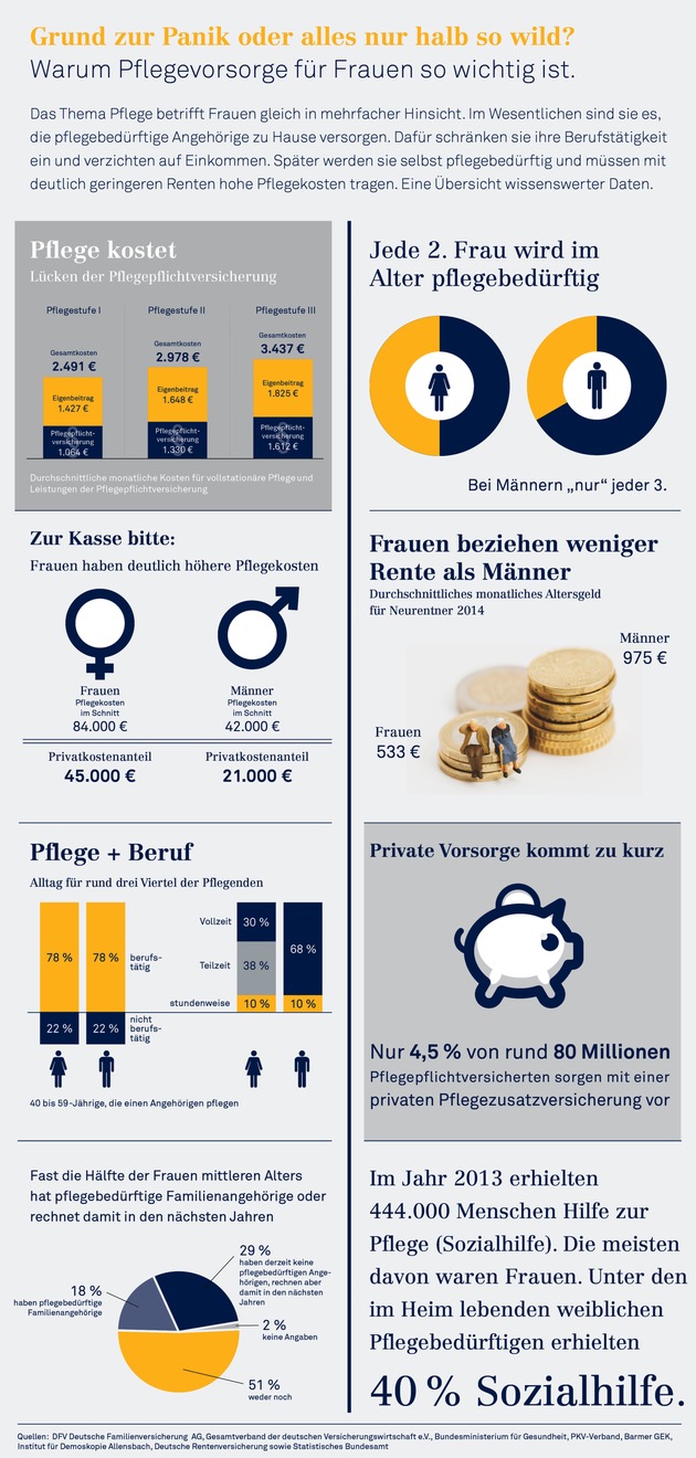 "Pflegebedürftigkeit?" Zu oft noch kein Thema, doch die heute 40- bis 50-jährigen Frauen merken allmählich, dass sie dieser Frage nicht länger aus dem Weg gehen sollten. Meist sind es zuerst die Eltern, die pflegebedürftig werden und um die sie sich kümmern müssen. Als Nächstes, so die Prognosen der Experten, der eigene Partner. Und irgendwann werden auch sie selbst mit hoher Wahrscheinlichkeit davon betroffen sein. Das wiegt umso schwerer, denn die Kinder sind dann längst aus dem Haus und das Alterseinkommen reicht häufig nicht aus, um die Pflegekosten zu decken. Und die gesetzliche Pflegepflichtversicherung trägt auch in Zukunft nur einen Teil davon.